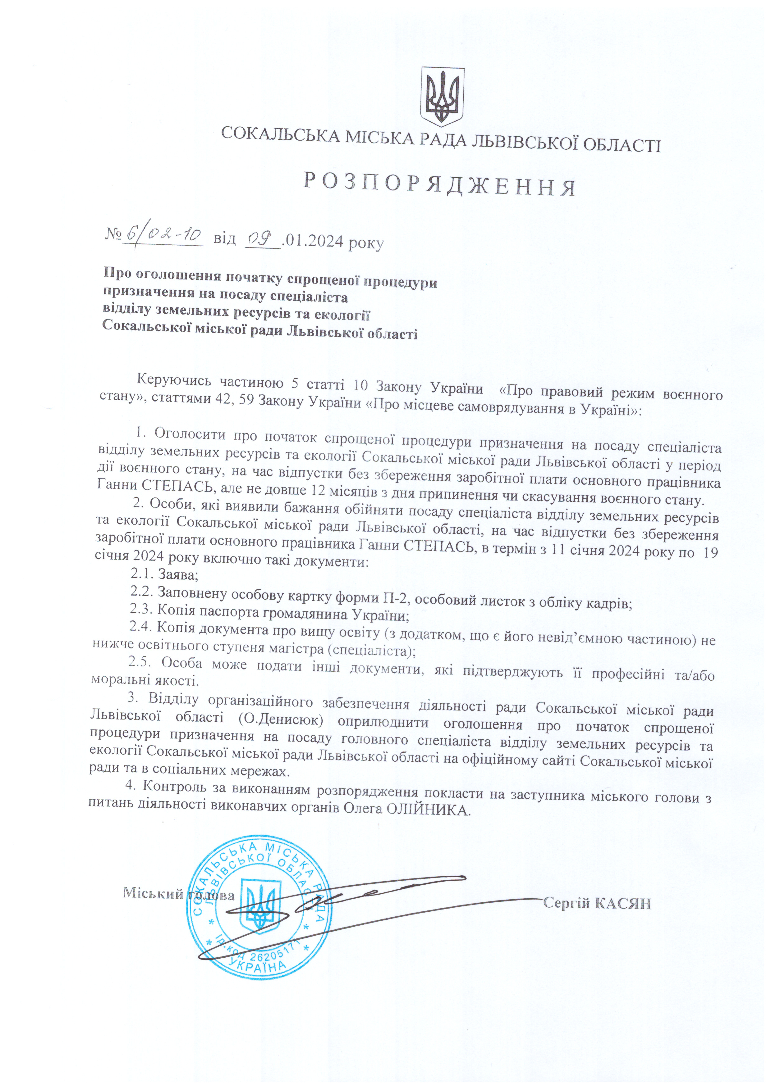 Розпорядження про початок спрощеної процедури призначення на посаду спеціаліста відділу земельних відносин та екології