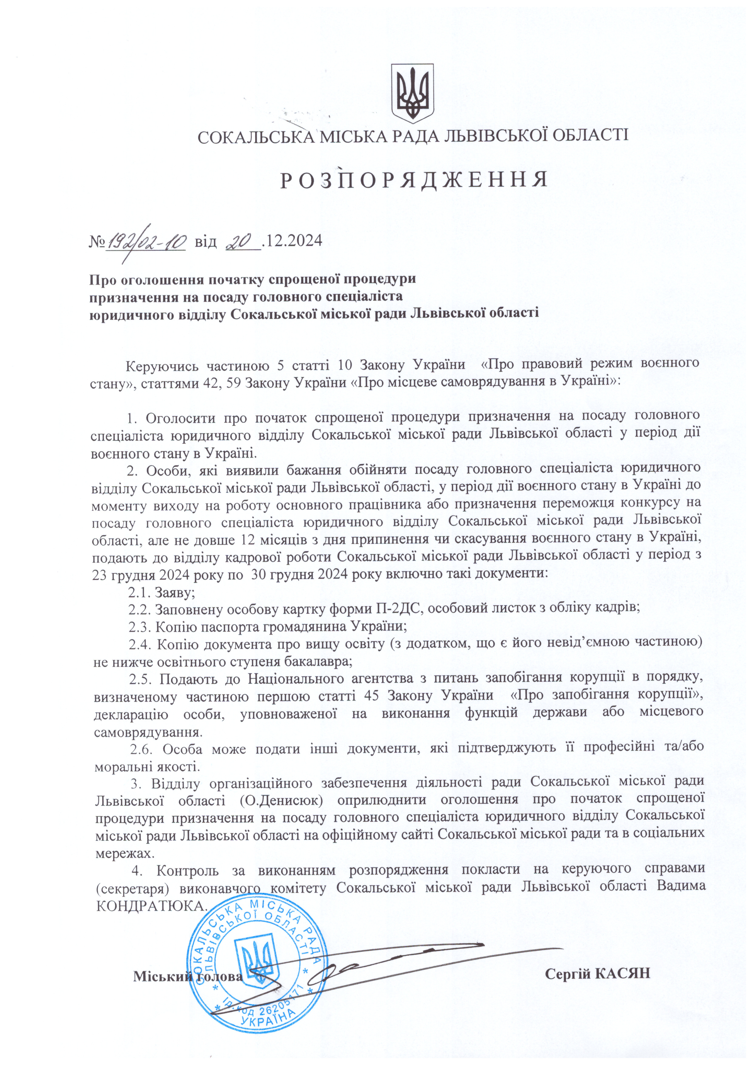 Розпорядження про оголошення спрощеної процедури призначення на посаду головного спеціаліста юридичного відділу Сокальської міської ради