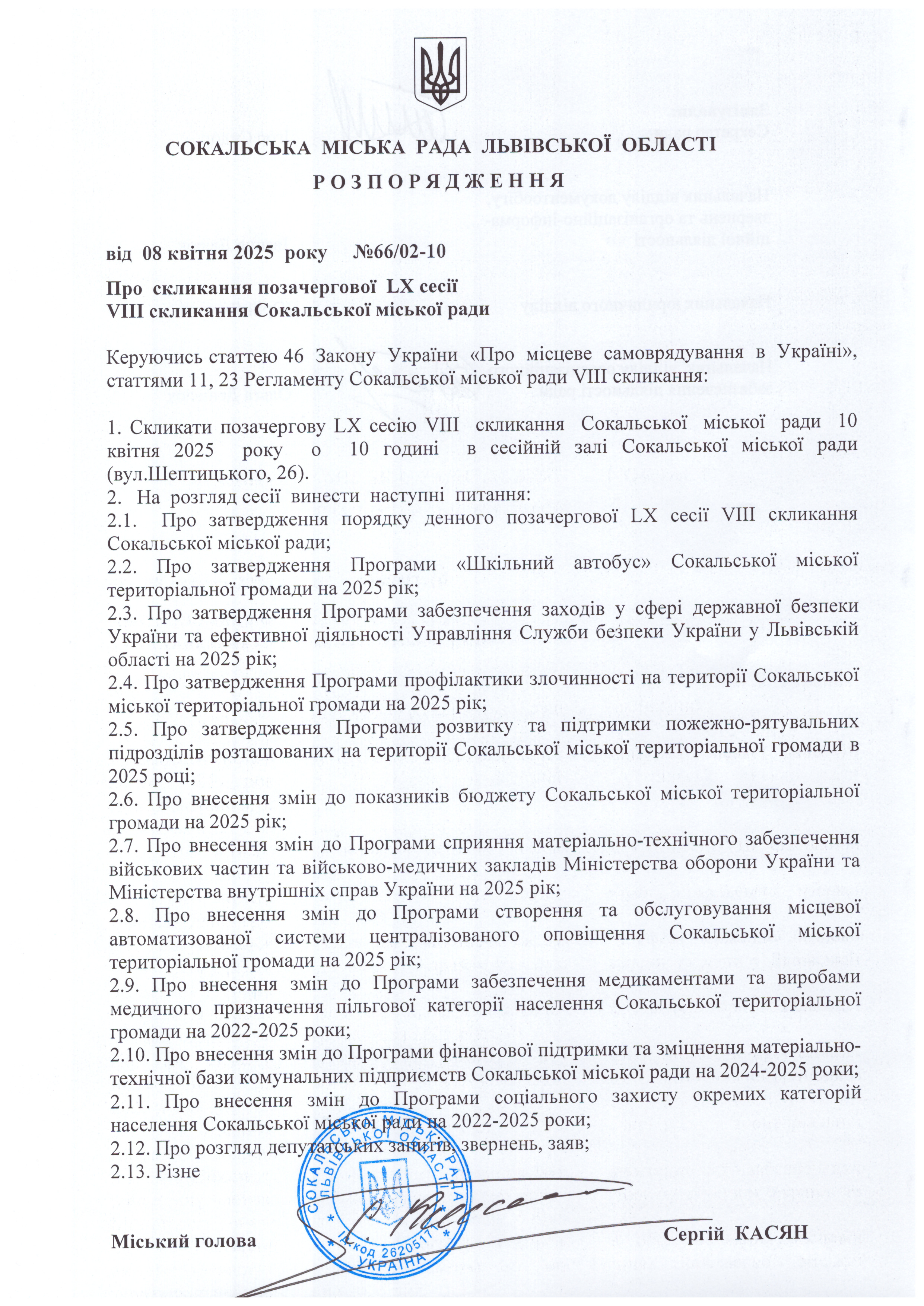 Розпорядження про скликання 60 позачергової сесії міської ради
