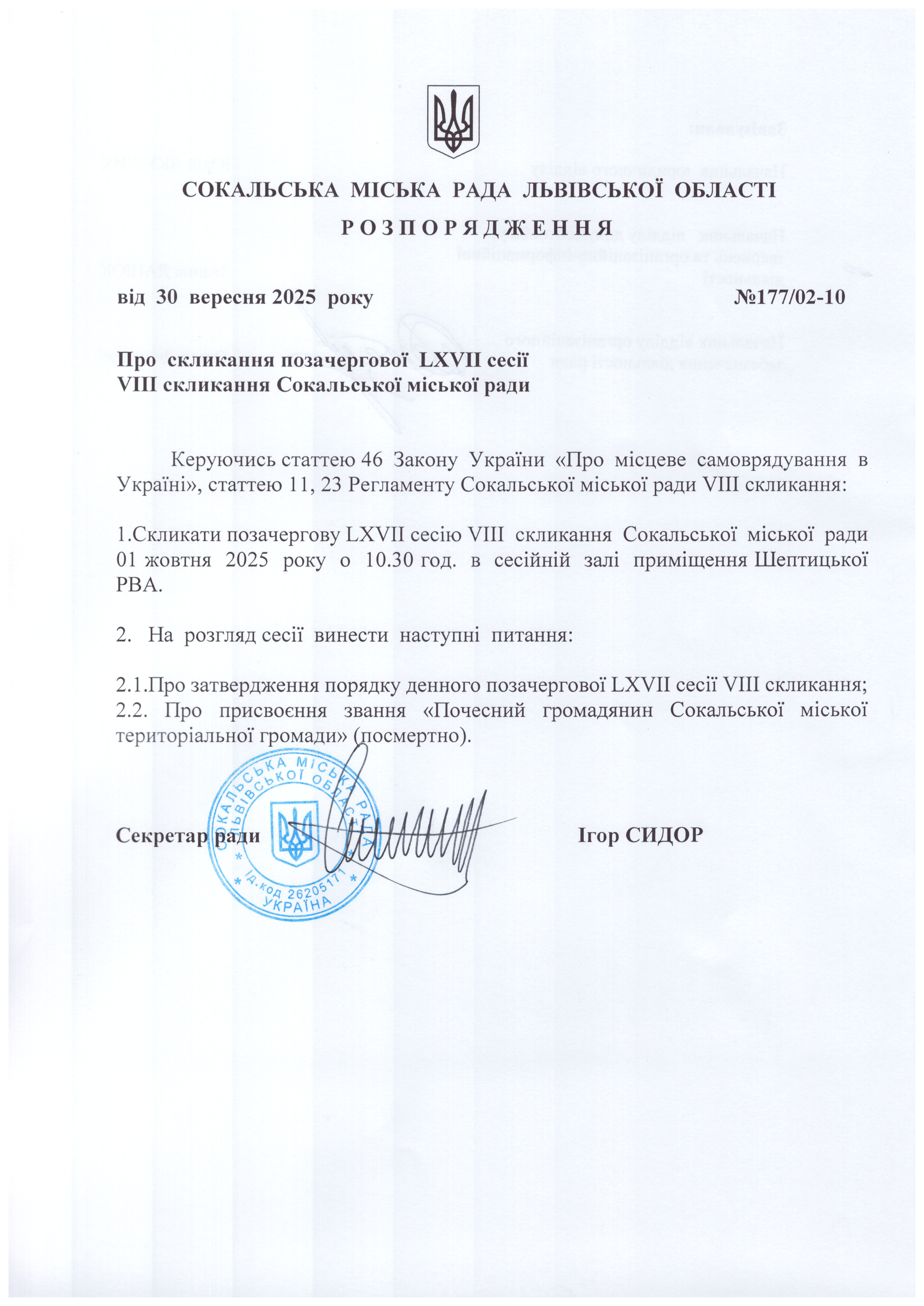 Розпорядження про скликання 67 сесії міської ради